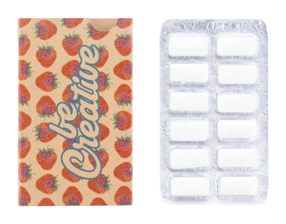 12 sztuk bezcukrowej gumy do żucia w blistrze z wykonanym na zamówienie, zadrukowanym w pełnym kolorze papierowym etui. MOQ: 100 szt.