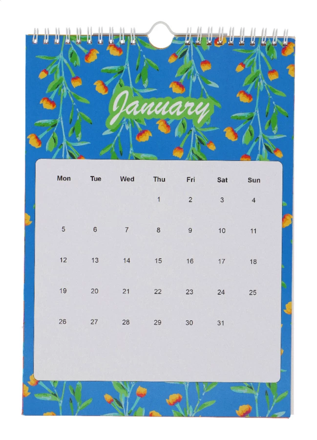 Kalendarz ścienny w formacie A4, oprawiony spiralnie, wykonany na zamówienie, z full kolorową grafiką i haczykiem do zawieszania. Zawiera 6 dwustronnych arkuszy miesięcznych i okładkę. Cena zawiera nadruk cyfrowy na wszystkich stronach. Min. ilość: 100 szt.
