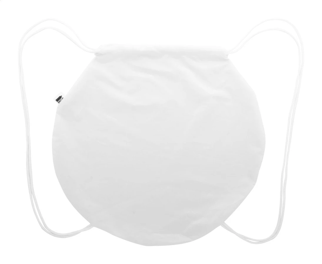 Personalizowana torba w kształcie kuli z kolorowymi sznurkami, poliester 190T RPET. Z nadrukowaną grafiką sublimacyjną i charakterystyczną metką RPET. Min. ilość: 25szt.
