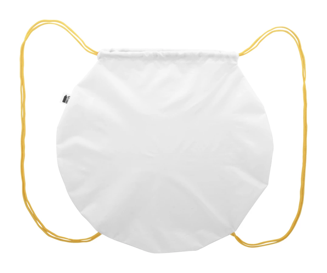 Personalizowana torba w kształcie kuli z kolorowymi sznurkami, poliester 190T RPET. Z nadrukowaną grafiką sublimacyjną i charakterystyczną metką RPET. Min. ilość: 25szt.