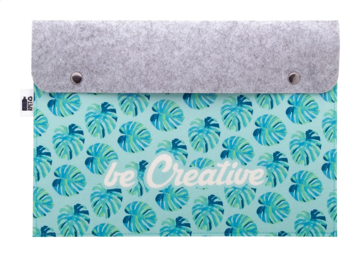 Personalizowana teczka na dokumenty z filcu RPET (format A4) z full kolorowym nadrukiem z przodu i zapięciem na zatrzask. Z charakterystyczną metką RPET. Z nadrukowaną grafiką sublimacyjną. Min. ilość: 25 szt.
