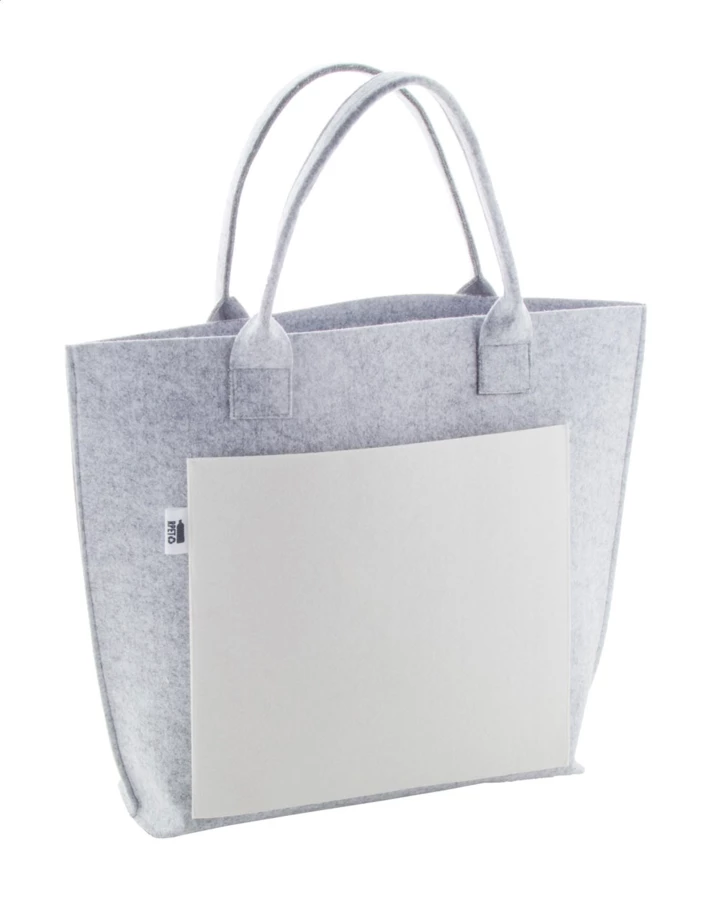 Personalizowana torba na zakupy z filcu RPET, z przednią kieszenią z kolorowym nadrukiem. Z krótkimi uchwytami, dolnym klinem i charakterystyczną metką RPET. Cena obejmuje nadruk sublimacyjny. Min ilość: 50 szt.