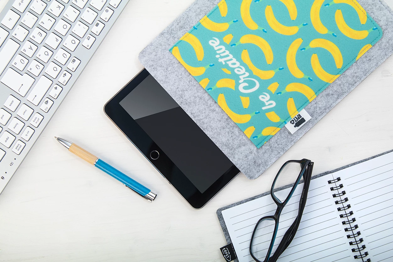 Personalizowany, filcowy uchwyt na tablet RPET z przednią kieszenią z full kolorowym nadrukiem. Z charakterystyczną metką RPET. Pasuje na tablety do 11". Cena zawiera nadruk sublimacyjny. Min.ilość: 25 szt.