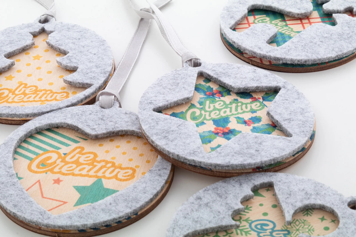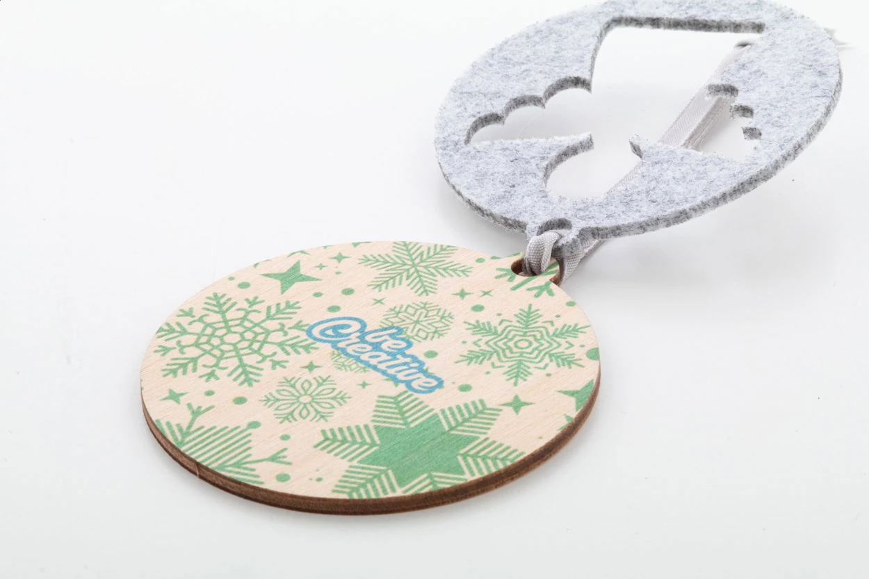 Personalizowana, dwuwarstwowa ozdoba choinkowa z filcu RPET i sklejki brzozowej z srebrną wstążką i wyciętym wzorem świątecznym na wierzchniej warstwie. Cena Cena obejmuje nadruk UV LED na spodniej warstwie. Min. ilość: 100 szt.
