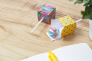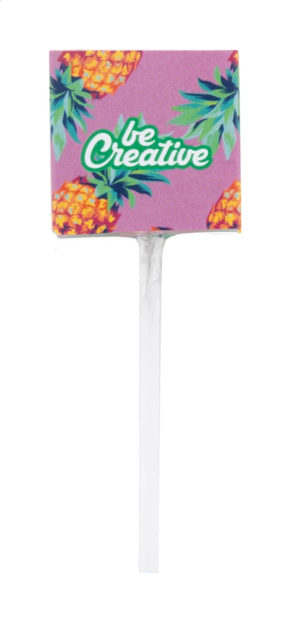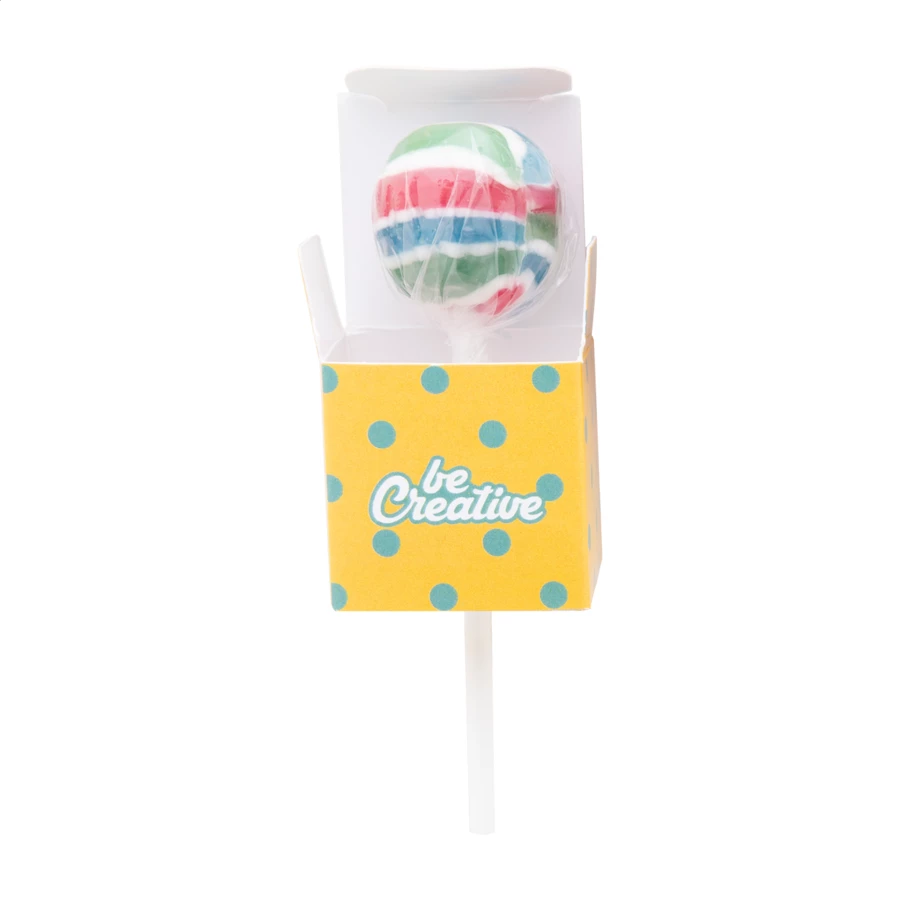 Lizak o smaku wieloowocowym (8 g) w wykonanym na zamówienie, kolorowym, zadrukowanym pudełku papierowym. Min. ilość: 100 szt.