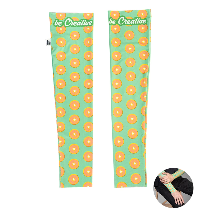Jedna para elastycznych rękawów RPET, wykonanych na zamówienie, z nadrukowaną grafiką sublimacyjną na całej powierzchni. Wykonane w 92% z poliestru RPET i w 8% z elastanu (185 g/m²), z charakterystyczną metką RPET. Min. ilość: 50 szt. Rozmiary: M (8×12×48 cm), L (9,5×13,5×52 cm).
