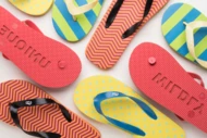 Personalizowane japonki z podeszwą PE i taśmą PVC. Produkt składany jest z dowolnej kombinacji kolorystycznej podeszw i pasków. Min.ilość: 50 par.