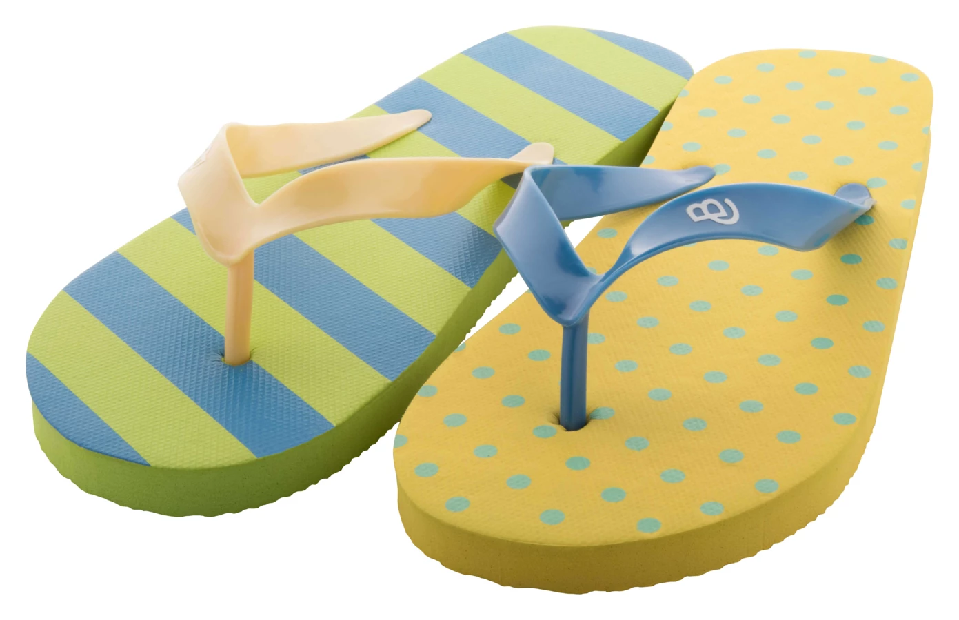 Personalizowane japonki z podeszwą PE i taśmą PVC. Produkt składany jest z dowolnej kombinacji kolorystycznej podeszw i pasków. Min.ilość: 50 par.