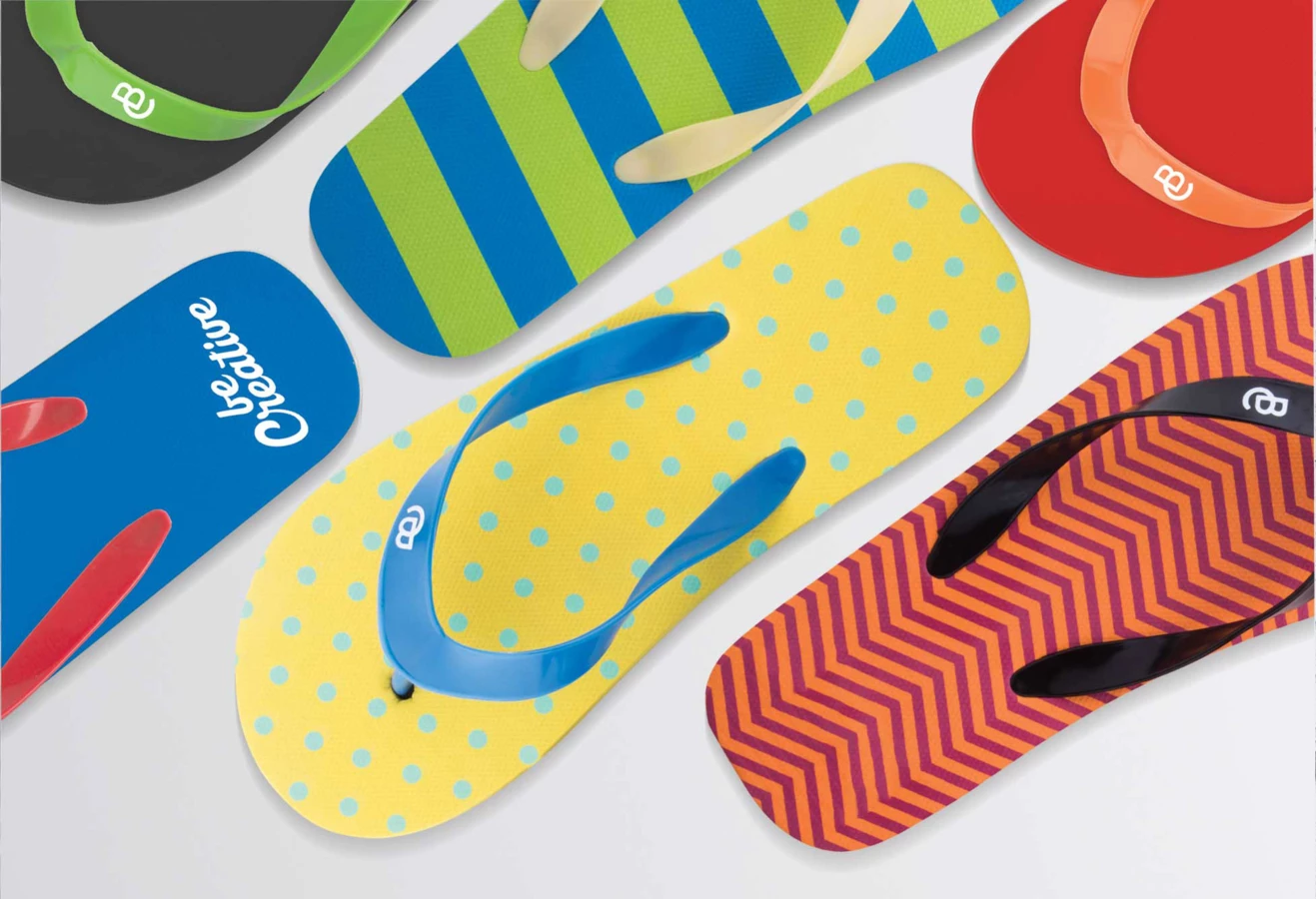 Personalizowane japonki z podeszwą PE i taśmą PVC. Produkt składany jest z dowolnej kombinacji kolorystycznej podeszw i pasków. Min.ilość: 50 par.