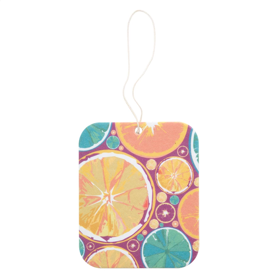 Personalizowany zapach do samochodu o indywidualnym kształcie i zapachu (egzotyczny, zielone jabłko, cytryna, nowy samochód, ocean, wanilia, luksus, mentol). Znakowanie do 4 kolorów CMYK po obu stronach. Min. ilość. 250 sztuk.