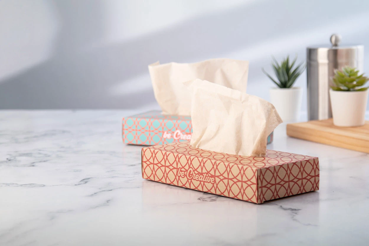 100 szt. 2-warstwowych chusteczek papierowych z recyklingu w dyspenserem z papieru kraft. Cena obejmuje nadruk full kolor. Min. ilość: 100 szt.