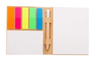 Wykonany na zamówienie notatnik samoprzylepny w okładce z papieru kraft z mini drewnianym ołówkiem. Zawiera karteczki samoprzylepne z makulatury w 2 rozmiarach (50 kartek 100×75 mm, 25 kartek 50×75 mm) i 100 zakładek z folii plastikowej w 5 różnych kolorach (12×44 mm). Cena obejmuje zadrukowaną w full kolorze okładkę zewnętrzną. Min. ilość: 100 szt.