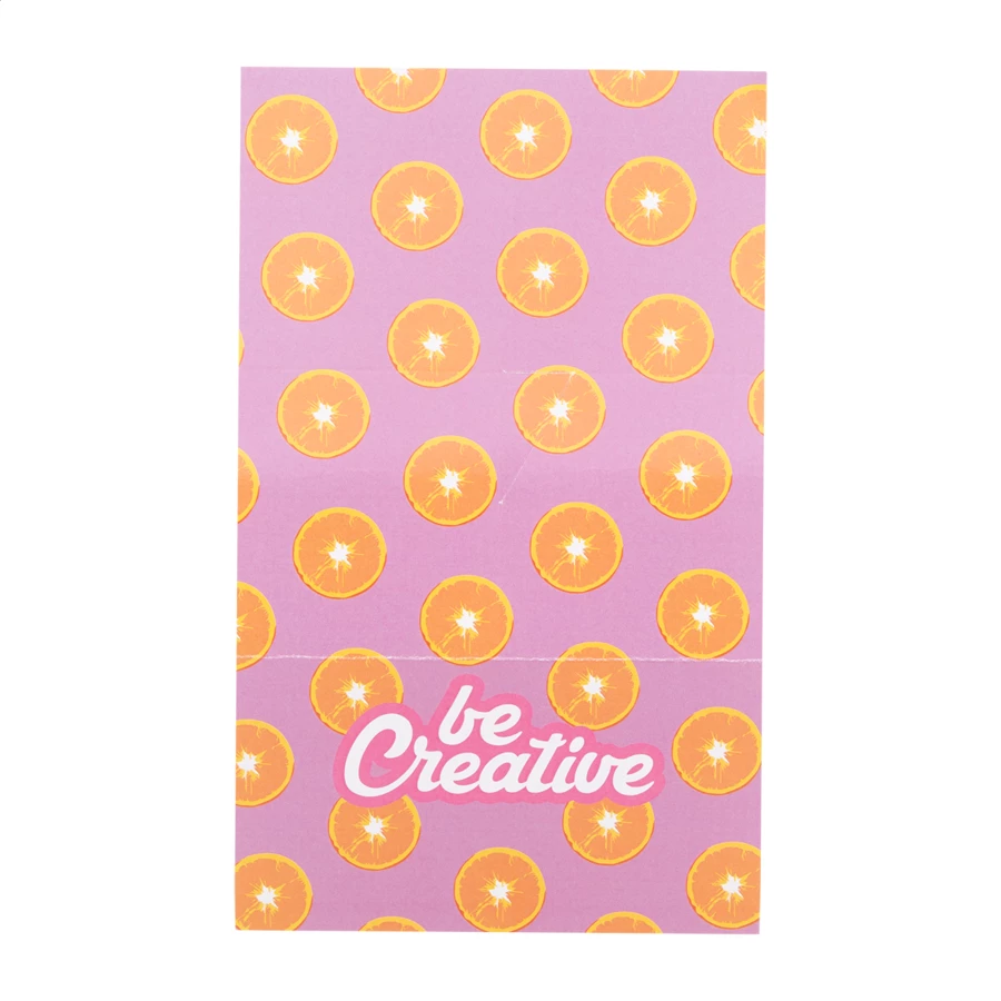 Wykonany na zamówienie dozownik na karteczki na notatki z pionowym nagłówkiem. Zawiera 50 arkuszy samoprzylepnych kartek z papieru pochodzącego z recyklingu (75×75 mm) i 100 plastikowych zakładek do stron w 5 różnych kolorach (44×12 mm). Cena obejmuje full kolorowy nadruk na nagłówku. Min. ilość: 100 szt.