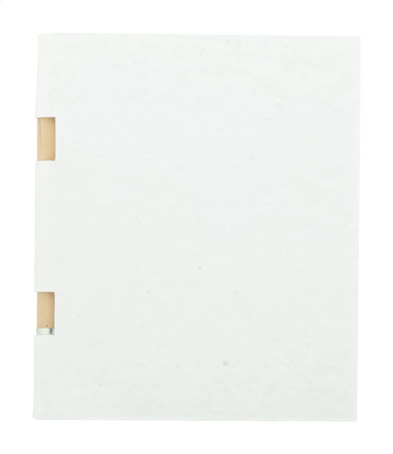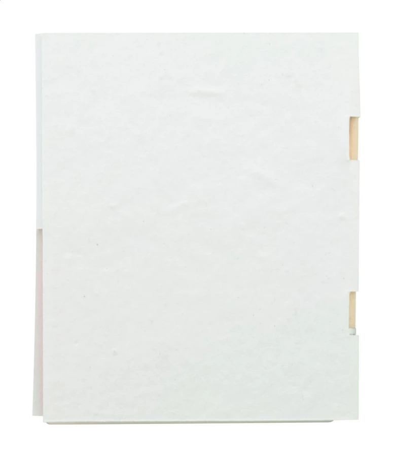 Personalizowany notatnik z okładką z papieru nasiennego wykonany na zamówienie z mini drewnianym ołówkiem. Zawiera karteczki samoprzylepne z papieru pochodzącego z recyklingu w 2 rozmiarach (50 arkuszy 100×75 mm, 25 arkuszy 50×75 mm) i 100 plastikowych zakładek w 5 różnych kolorach (12×44 mm). Cena obejmuje okładkę zewnętrzną z nadrukiem w full kolorze. Min. ilość: 100 szt. Z różnymi nasionami dzikich kwiatów.
