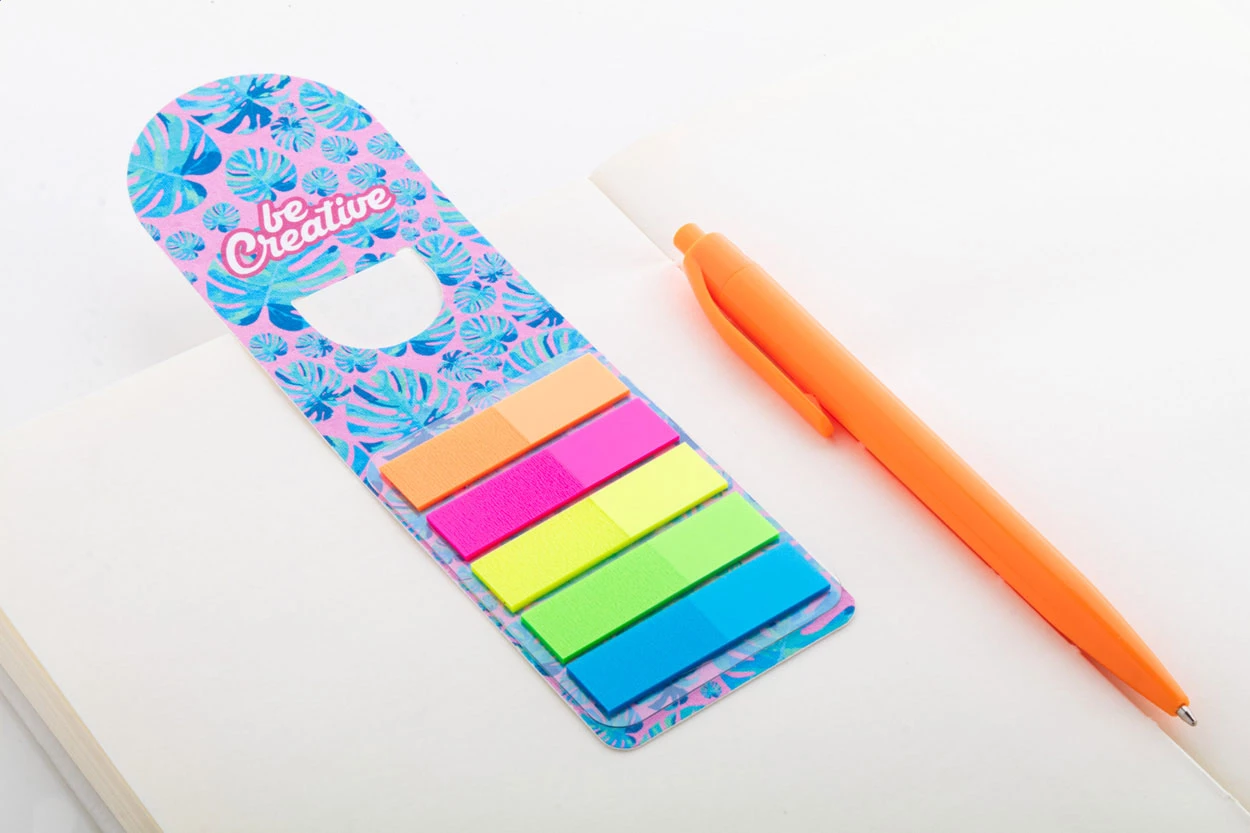 Wykonana na zamówienie, zakładka do książki z papieru nasiennego ze znacznikami stron. Zawiera 100 plastikowych znaczników stron w 5 różnych kolorach (44×12 mm). Cena obejmuje nadruk w full kolorze z przodu. Min. ilość: 100 szt. Z różnymi nasionami dzikich kwiatów.