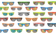 Personalizowane, plastikowye okulary z filtrem UV 400. Produkt składany z wybranym kolorystycznie oprawek i zaucszników. Min.ilość: 50 szt.