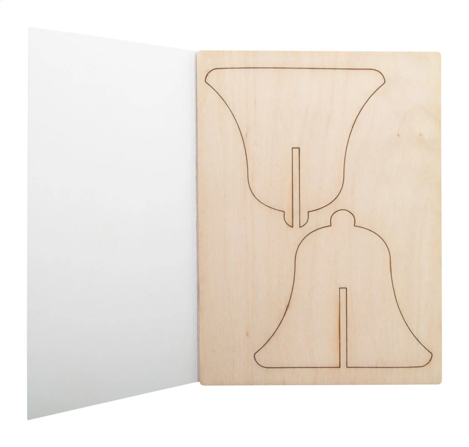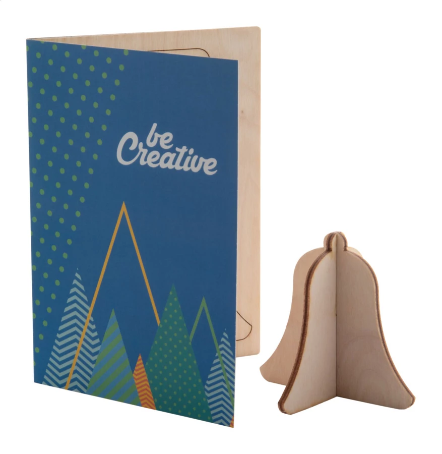 Personalizowana, papierowa karta świąteczna z dowolną grafiką po obu stronach i drewnianą ozdobą do składania. Zawiera kopertę C6. Min. zamówienie: 100 szt.