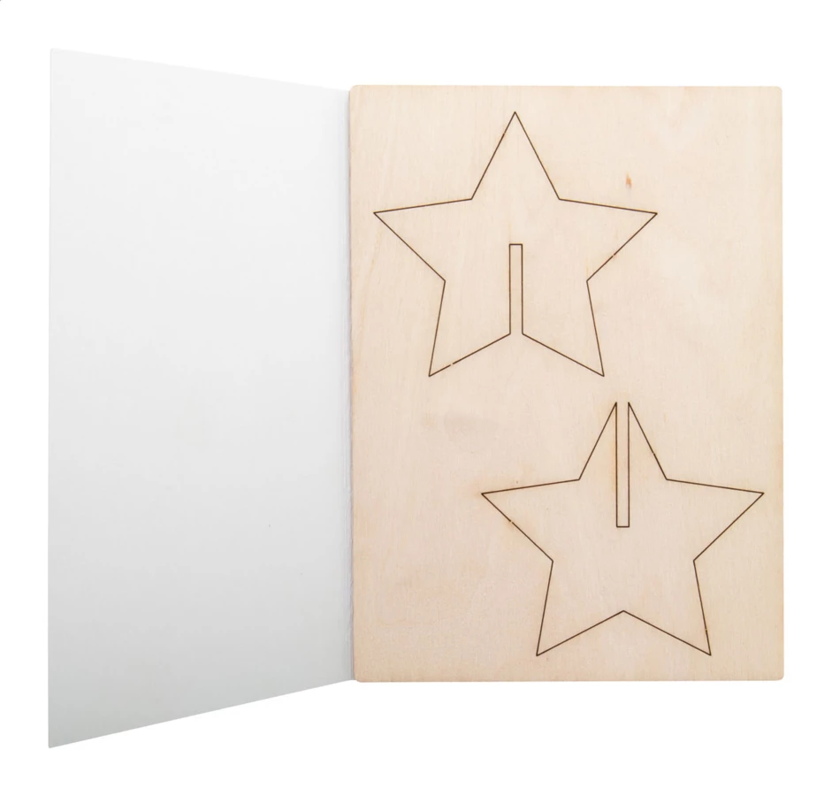 Personalizowana, papierowa karta świąteczna z dowolną grafiką po obu stronach i drewnianą ozdobą do składania. Zawiera kopertę C6. Min. zamówienie: 100 szt.