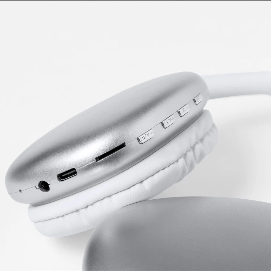 Bezprzewodowe słuchawki z tworzywa ABS z nausznikami ze skóry PU i wbudowanym akumulatorem. Z zestawem głośnomówiącym i funkcją odtwarzania plików MP3 z micro SD. W zestawie kable audio Jack 3,5 mm i ładowarka USB.