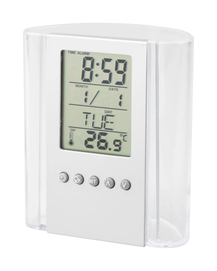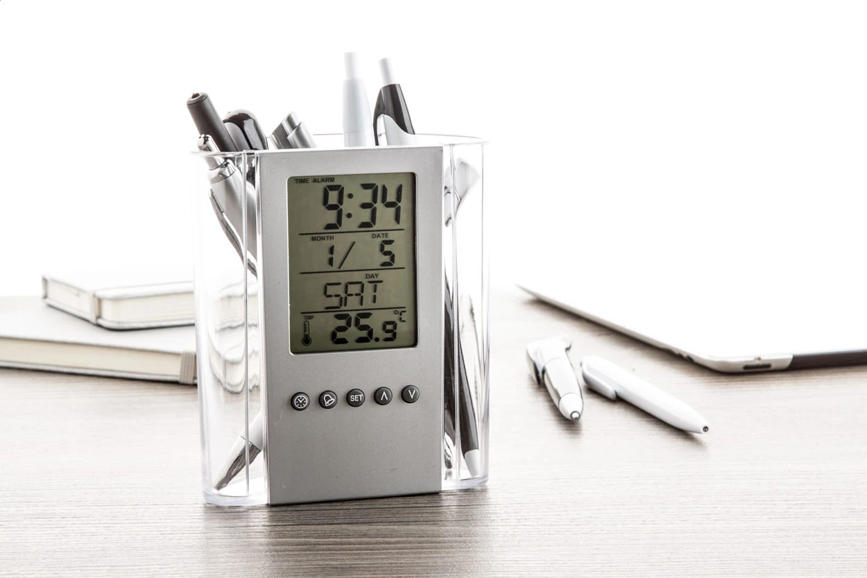 Przezroczysty, wielofunkcyjny stojak biurkowy z plastiku z miejscem na długopisy i wyświetlaczem. Posiada funkcje termometru, zegara, alarmu i kalendarza. Z baterią guzikową w zestawie.