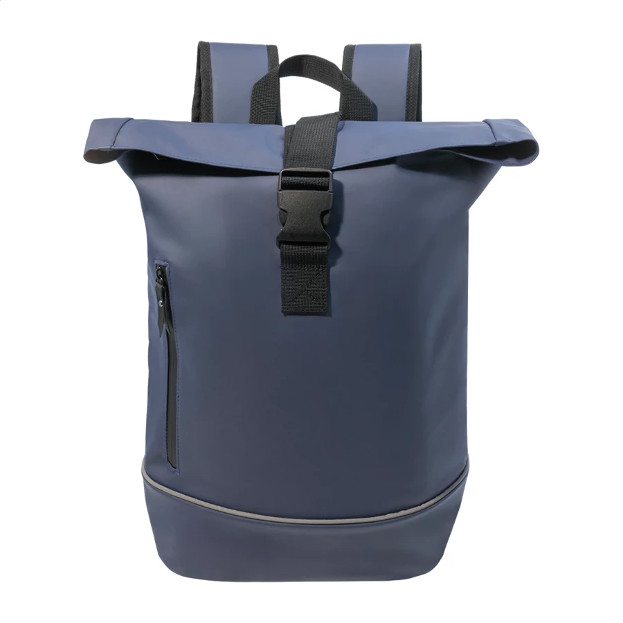 Wodoodporny, miękki plecak zwijany z recyklingowanej skóry PU z główną komorą zapinaną na zamek błyskawiczny z klamrą, przednią kieszenią z wodoodpornym zamkiem błyskawicznym, wyściełaną przegrodą na laptopa (15") i odblaskowym paskiem. Z wyściełanymi plecami i paskami na ramiona. Z charakterystyczną metką z recyklingowanego PU.