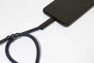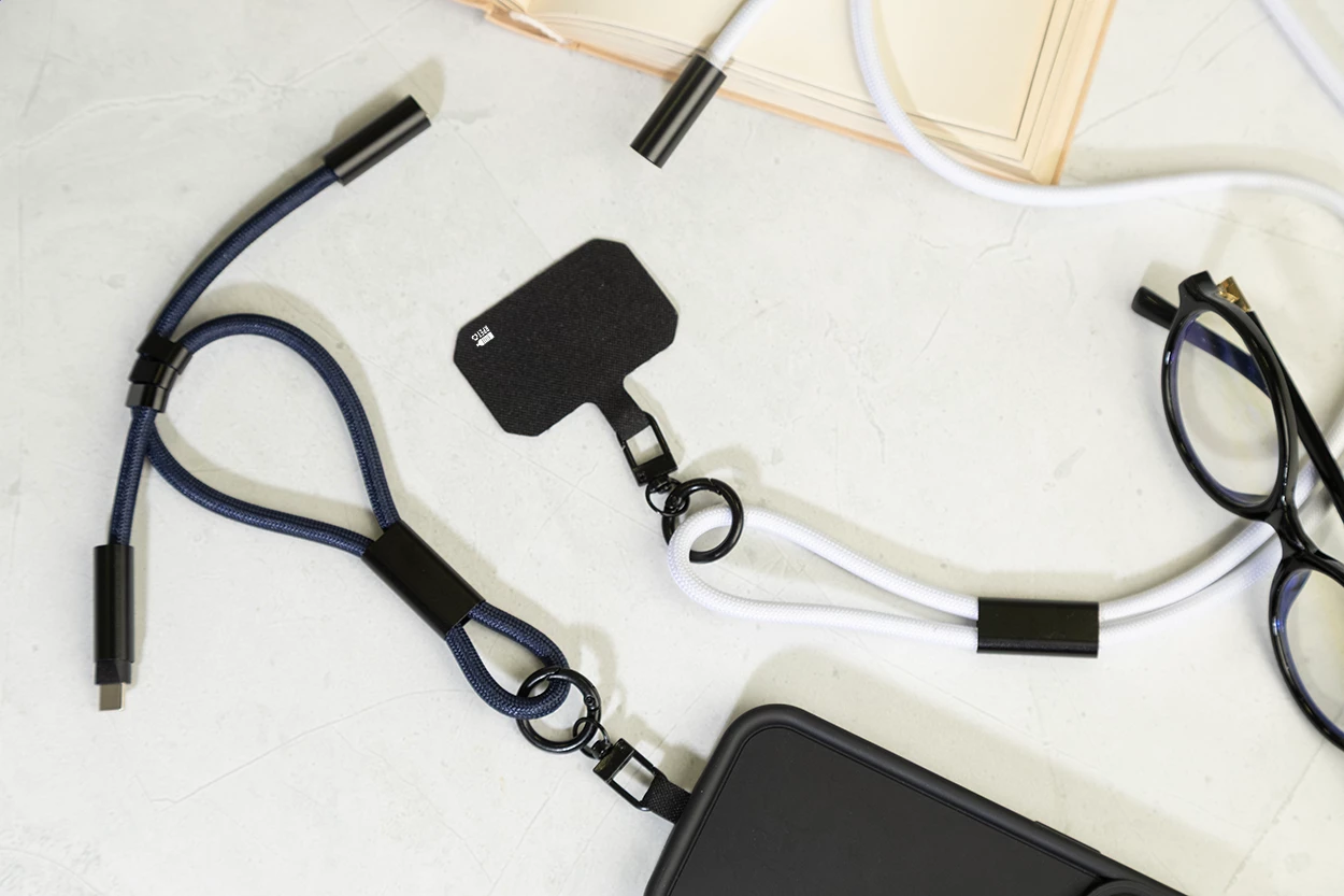 Opaska na nadgarstek z uchwytem na telefon RPET, karabińczykiem i zintegrowanym kablem ładującym USB-C do USB-C z ukrytymi złączami. Obsługuje szybkie ładowanie PD 60 W i przesyłanie danych.