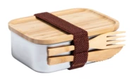 Pudełko na lunch ze stali nierdzewnej z pokrywką z naturalnego bambusa. Ze sztućcami (nóż i widelec) oraz elastycznym paskiem. 600 ml.