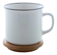 Kubek "vintage" z wysokiej jakości porcelany w białym kolorze z czarną obręczą i bambusową podkładką. 320 ml. W kartoniku.