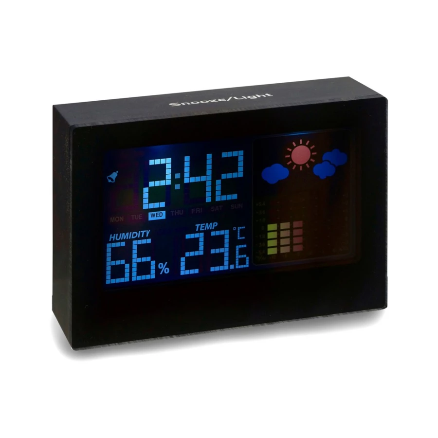Cyfrowa stacja pogodowa, zegar, alarm, wskazuje temperaturę, wilgotność powietrza, podświetlany wyświetlacz