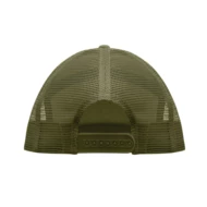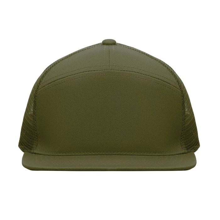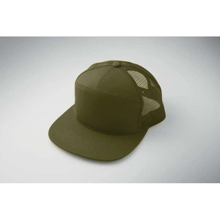 7-panelowa czapka z płaskim daszkiem z bawełnianego twillu z poliestrową siateczką z tyłu i plastikowym zapięciem.