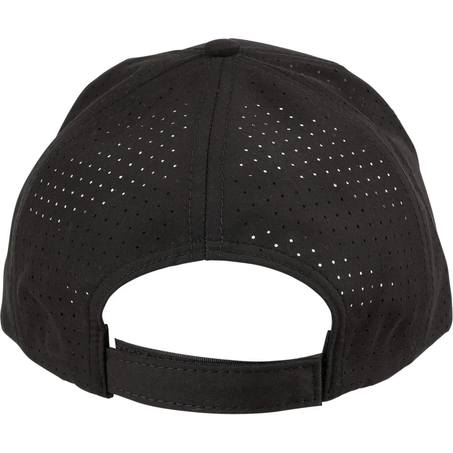 Czapka z daszkiem z laserowo wyciętymi otworami wentylacyjnymi na tylnych panelach, posiada 7-panelową konstrukcję z jednym panelem z przodu oraz daszek o długości 7 cm, regulowana i oddychająca, bez etykiety PU, produkt wykonany z poliestru