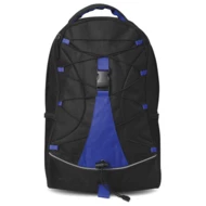 Czarny plecak z kolorową, kontrastową wkładką i dekoracyjną linką z przodu, boczne kieszenie z siatki. Wykonany z poliestru 600D.