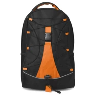 Czarny plecak z kolorową, kontrastową wkładką i dekoracyjną linką z przodu, boczne kieszenie z siatki. Wykonany z poliestru 600D.