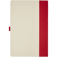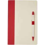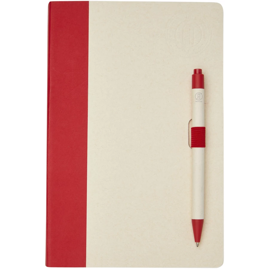 Zestaw z notatnikiem w formacie A5 i długopisem. Notatnik zawiera 80 kartek w linie (80 g/m²) wykonanych z poddanych recyklingowi kartonów po mleku (do 70%), grzbiet z kolorowego papieru i pętelkę na długopis. W pętelce na długopis znajduje się długopis na przycisk w dopasowanym do notatnika kolorze. Długopis ma korpus wykonany z tego samego materiału z kartonów mleka poddanych recyklingowi, a przycisk, klips i końcówka są wykonane z kolorowego tworzywa sztucznego PLA. W środku długopisu znajduje się czarny wkład. Zużyte kartony po mleku są zbierane, sortowane, przetwarzane i zamieniane w papier, co pozwala na przekształcenie odpadów w coś użytecznego.