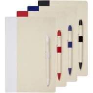 Zestaw z notatnikiem w formacie A5 i długopisem. Notatnik zawiera 80 kartek w linie (80 g/m²) wykonanych z poddanych recyklingowi kartonów po mleku (do 70%), grzbiet z kolorowego papieru i pętelkę na długopis. W pętelce na długopis znajduje się długopis na przycisk w dopasowanym do notatnika kolorze. Długopis ma korpus wykonany z tego samego materiału z kartonów mleka poddanych recyklingowi, a przycisk, klips i końcówka są wykonane z kolorowego tworzywa sztucznego PLA. W środku długopisu znajduje się czarny wkład. Zużyte kartony po mleku są zbierane, sortowane, przetwarzane i zamieniane w papier, co pozwala na przekształcenie odpadów w coś użytecznego.