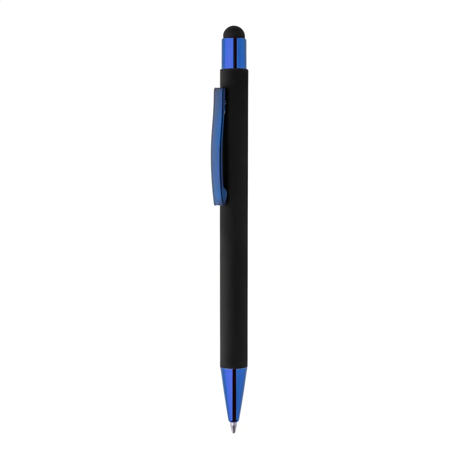 Długopis z recyklingowanego aluminium z końcówką do ekranów dotykowych, z czarną, gumowaną obudową i kolorowymi, błyszczącymi, metalowymi elementami. Ze specjalną powłoką do grawerowania lustrzanego, pasującą do metalowych elementów. Z niebieskim wkładem.