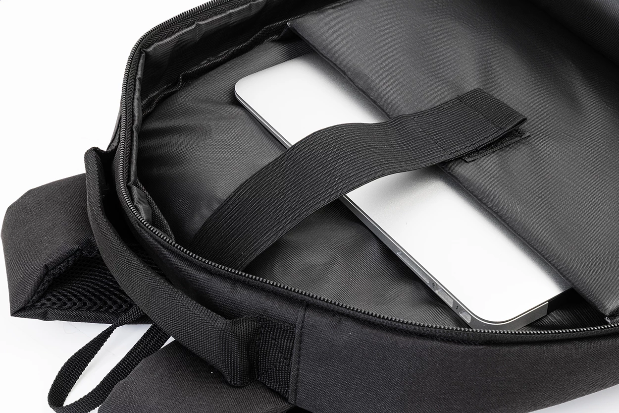 Plecak RPET z przegrodami zapinanymi na zamek, 2 kieszeniami z przodu zapinanymi na zamek, kieszeniami bocznymi zapinanymi na zamek oraz wyściełaną przegrodą na laptopa (15"). Z wyściełanymi plecami i paskami na ramię, kieszenią antykradzieżową i paskiem do noszenia na walizce. Wykonany z poliestru RPET 300D, z charakterystyczną metką RPET.