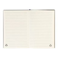 Notes w oprawie z recyklingowanej skóry PU, z ozdobnymi paskami i metalową płytką z logo. Z zakładką i 80 kartkami w linie z papieru z recyklingu. Format A5.