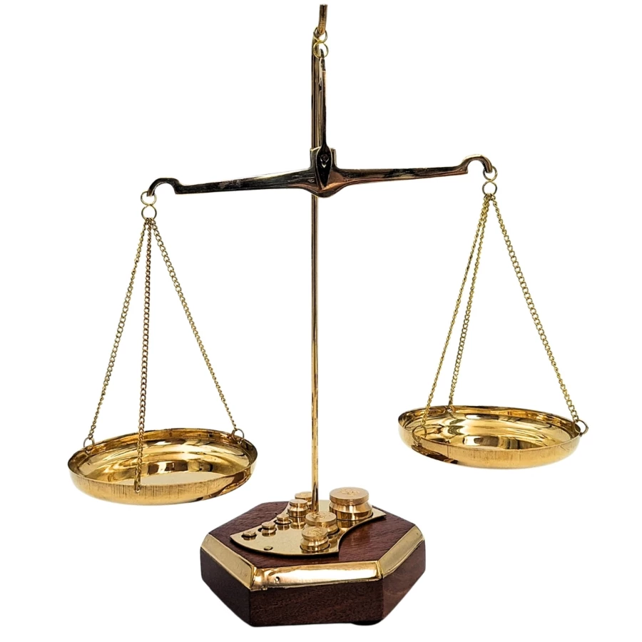 Dekoracyjna waga szalkowa to stylowa ozdoba w klimacie vintage, która idealnie uzupełni wnętrza z duszą – od gabinetu, przez bibliotekę, aż po rustykalną kuchnię czy aptekę. Wykonana z mosiądzu i osadzona na solidnej drewnianej podstawie, zachwyca detalem i nawiązuje do tradycyjnych wag używanych już w czasach starożytnych.