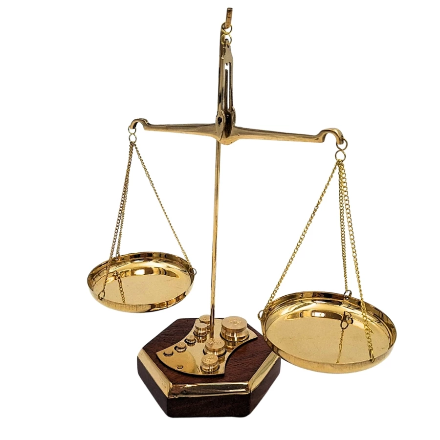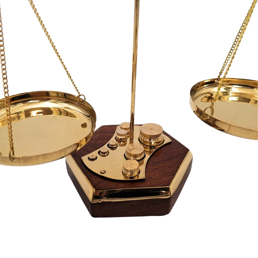 Dekoracyjna waga szalkowa retro z odważnikami – mosiądz + drewno – NC2144H