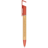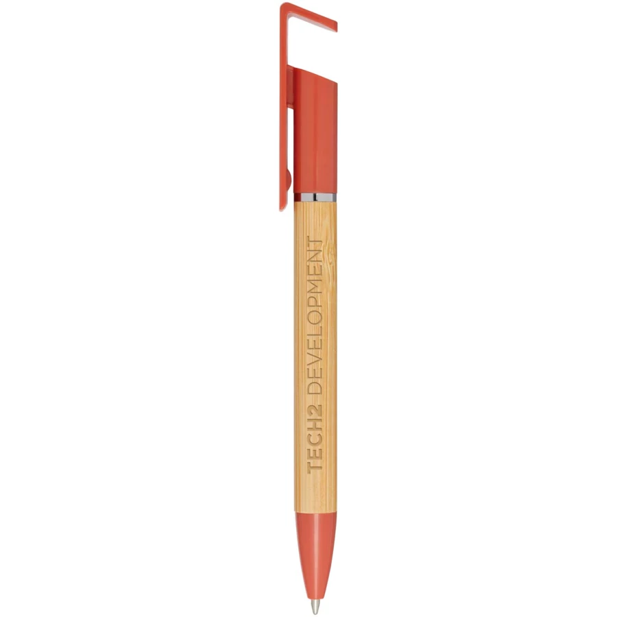 Bambusowy długopis, który pełni także funkcję uchwytu na telefon. Przycisk i środkowy pierścień wykonane są z tworzyw sztucznych pochodzących z recyklingu, końcówka z mosiądzu, a korpus z bambusa pozyskiwanego w sposób zrównoważony. Kolor tuszu: Niebieski. Żywotność: 1000 metrów. Rozmiar stalówki: 1,0 mm.