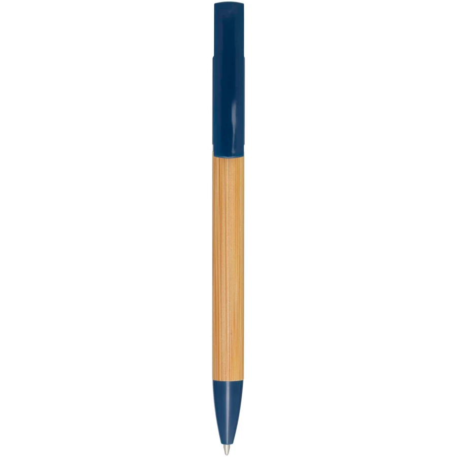 Bambusowy długopis, który pełni także funkcję uchwytu na telefon. Przycisk i środkowy pierścień wykonane są z tworzyw sztucznych pochodzących z recyklingu, końcówka z mosiądzu, a korpus z bambusa pozyskiwanego w sposób zrównoważony. Kolor tuszu: Niebieski. Żywotność: 1000 metrów. Rozmiar stalówki: 1,0 mm.
