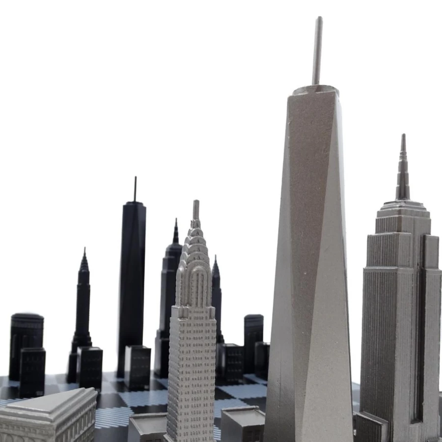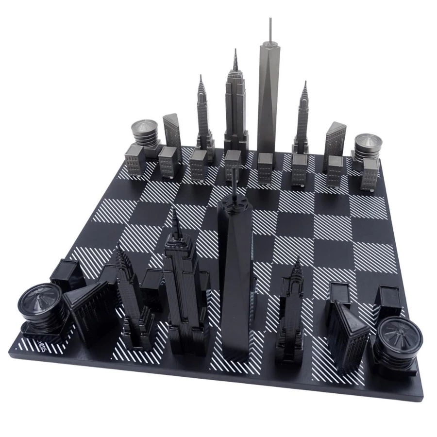 Designerskie szachy Skyline to elegancki i oryginalny zestaw szachowy, w którym figury przedstawiają najbardziej znane budynki Nowego Jorku, takie jak Empire State Building, Chrysler Buildingm One World Trade Center czy Flatiron Building. Figury zostały wykonane ręcznie z litej stali nierdzewnej, a szachownica z drewna. Zestaw doskonale wpasuje się w eleganckie pomieszczenia, dodając im ekskluzywnego charakteru, a jednocześnie jest idealnym prezentem dla miłośników szachów, architektury i designu.