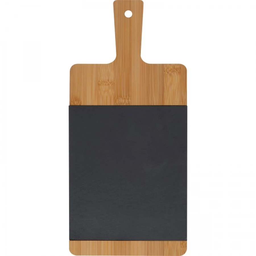 Deska kuchenna, do serwowania przekąsek, wykonana z drewna bambusowego z wkładką z łupka. Posiada rączkę do przenoszenia i oczko do zawieszenia na ścianie.