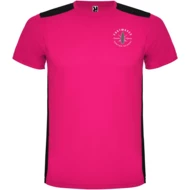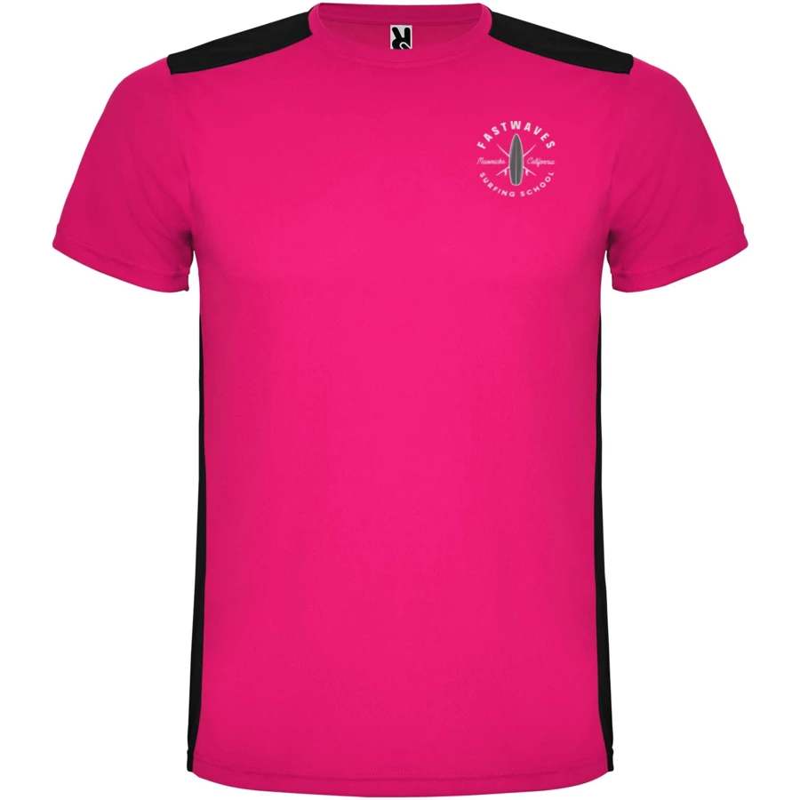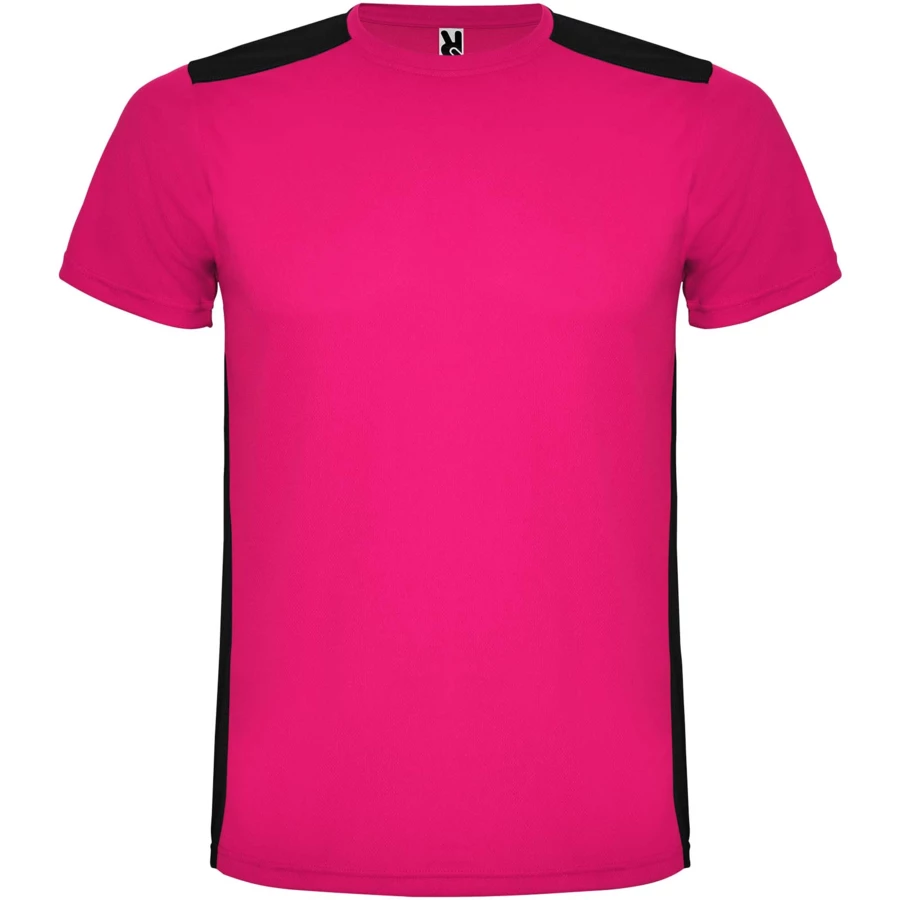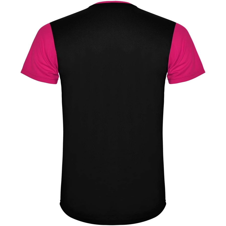 Łatwoschnący, techniczny i oddychający materiał. Okrągły kołnierzyk. Połączenie dwóch materiałów poliestrowych na plecach i ramionach. Materiał o splocie Birdseye z przodu i oddychająca siateczka 3D z tyłu. Materiał przygotowany na wchłanianie wilgoci. Ozdobny ścieg zygzakowy po bokach i na ramionach. Wzór na plecach nieco dłuższy. Usuwalna etykieta.