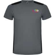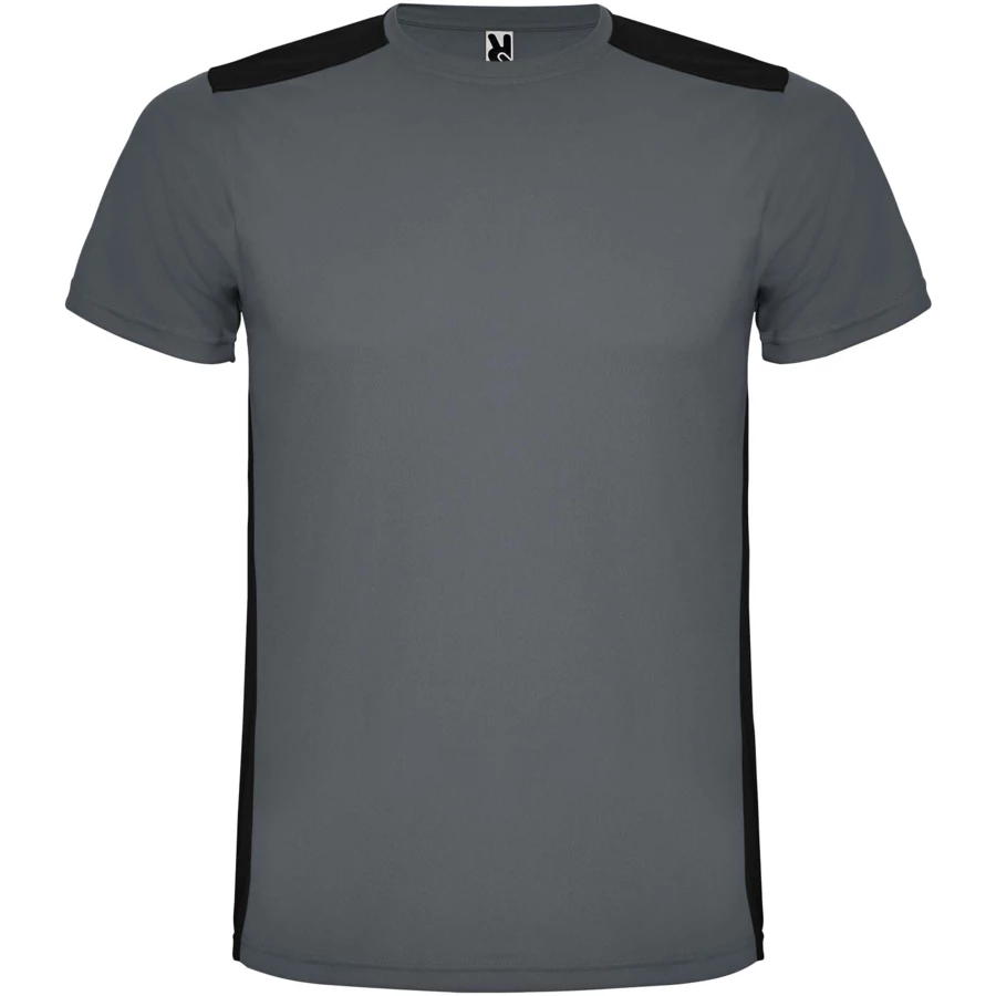 Łatwoschnący, techniczny i oddychający materiał. Okrągły kołnierzyk. Połączenie dwóch materiałów poliestrowych na plecach i ramionach. Materiał o splocie Birdseye z przodu i oddychająca siateczka 3D z tyłu. Materiał przygotowany na wchłanianie wilgoci. Ozdobny ścieg zygzakowy po bokach i na ramionach. Wzór na plecach nieco dłuższy. Usuwalna etykieta.