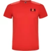 Łatwoschnący, techniczny i oddychający materiał. Okrągły kołnierzyk. Połączenie dwóch materiałów poliestrowych na plecach i ramionach. Materiał o splocie Birdseye z przodu i oddychająca siateczka 3D z tyłu. Materiał przygotowany na wchłanianie wilgoci. Ozdobny ścieg zygzakowy po bokach i na ramionach. Wzór na plecach nieco dłuższy. Usuwalna etykieta.