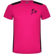 Łatwoschnący, techniczny i oddychający materiał. Okrągły kołnierzyk. Połączenie dwóch materiałów poliestrowych na plecach i ramionach. Materiał o splocie Birdseye z przodu i oddychająca siateczka 3D z tyłu. Materiał przygotowany na wchłanianie wilgoci. Ozdobny ścieg zygzakowy po bokach i na ramionach. Wzór na plecach nieco dłuższy. Usuwalna etykieta.