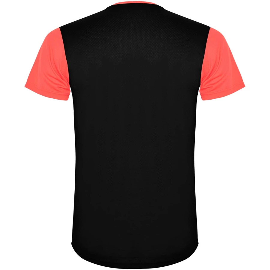 Łatwoschnący, techniczny i oddychający materiał. Okrągły kołnierzyk. Połączenie dwóch materiałów poliestrowych na plecach i ramionach. Materiał o splocie Birdseye z przodu i oddychająca siateczka 3D z tyłu. Materiał przygotowany na wchłanianie wilgoci. Ozdobny ścieg zygzakowy po bokach i na ramionach. Wzór na plecach nieco dłuższy. Usuwalna etykieta.