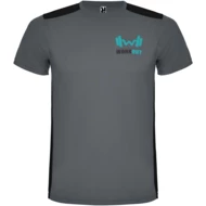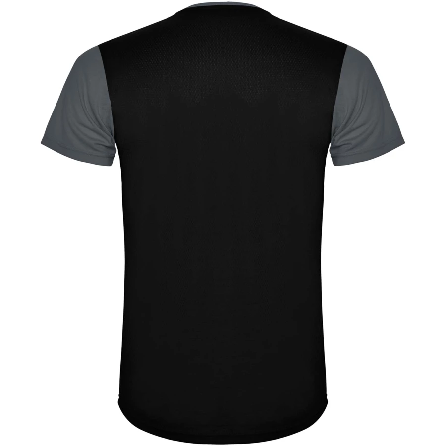 Łatwoschnący, techniczny i oddychający materiał. Okrągły kołnierzyk. Połączenie dwóch materiałów poliestrowych na plecach i ramionach. Materiał o splocie Birdseye z przodu i oddychająca siateczka 3D z tyłu. Materiał przygotowany na wchłanianie wilgoci. Ozdobny ścieg zygzakowy po bokach i na ramionach. Wzór na plecach nieco dłuższy. Usuwalna etykieta.